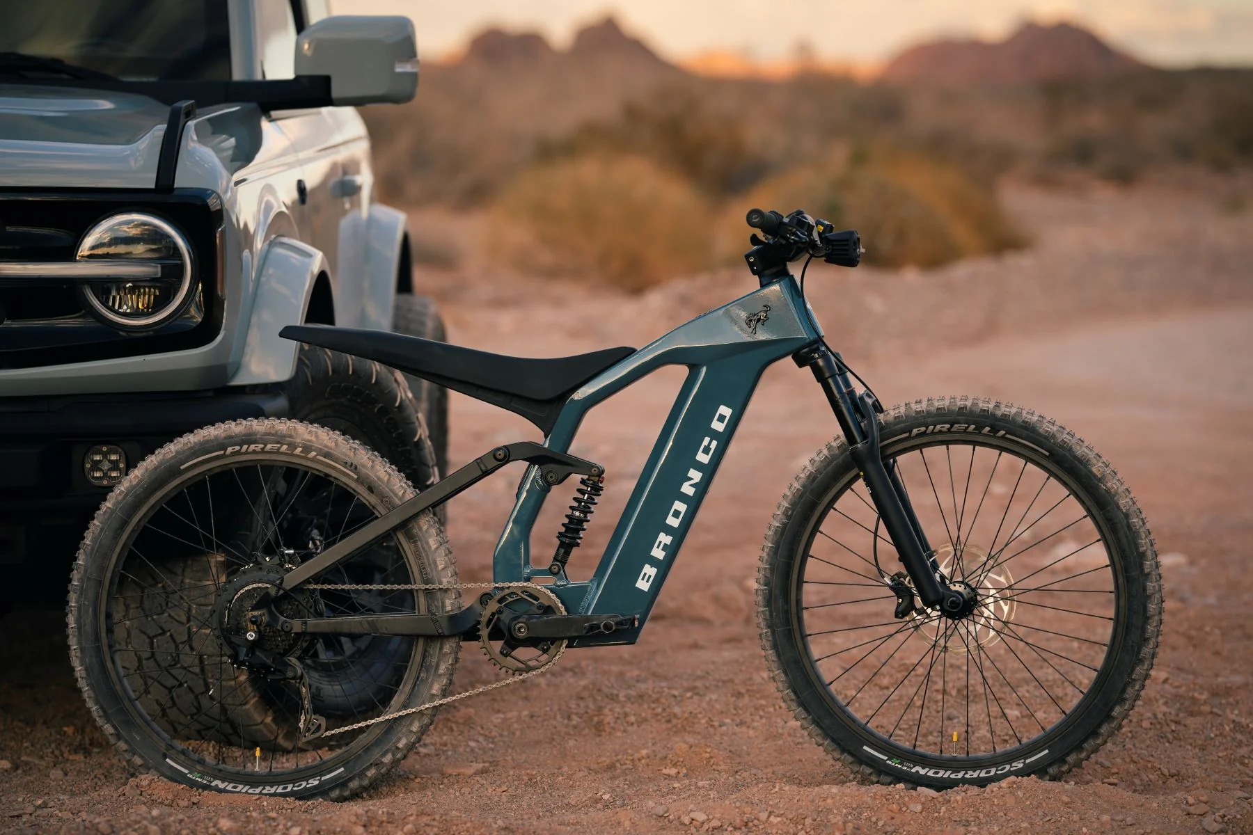Genuine Area 51 Ford Bronco paintwork with a red starter button ensures riders know they're on a Ford electric bike. Not just any Ford; and the legendary badge proudly declares that this eBike is a Bronco.