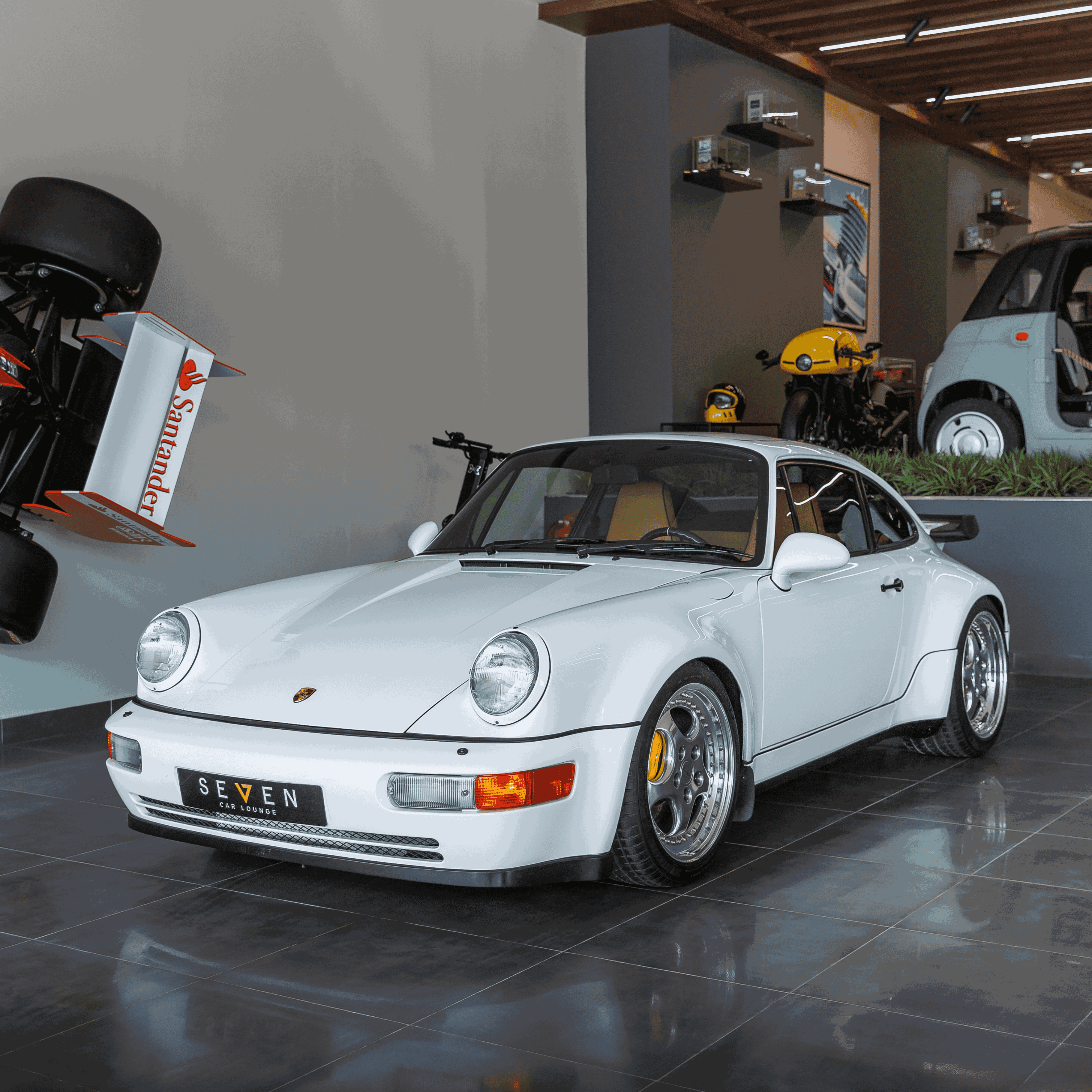 The Porsche 964 Turbo 3.6 presents a timeless silhouette defined by its wide stance and iconic Turbo proportions. Finished in classic White, the design is highlighted by muscular rear fenders, a distinctive rear spoiler, and clean, purposeful lines that reflect Porsche’s motorsport heritage. The 18-inch wheels complete the look, enhancing both presence and performance while staying true to the car’s original character.
